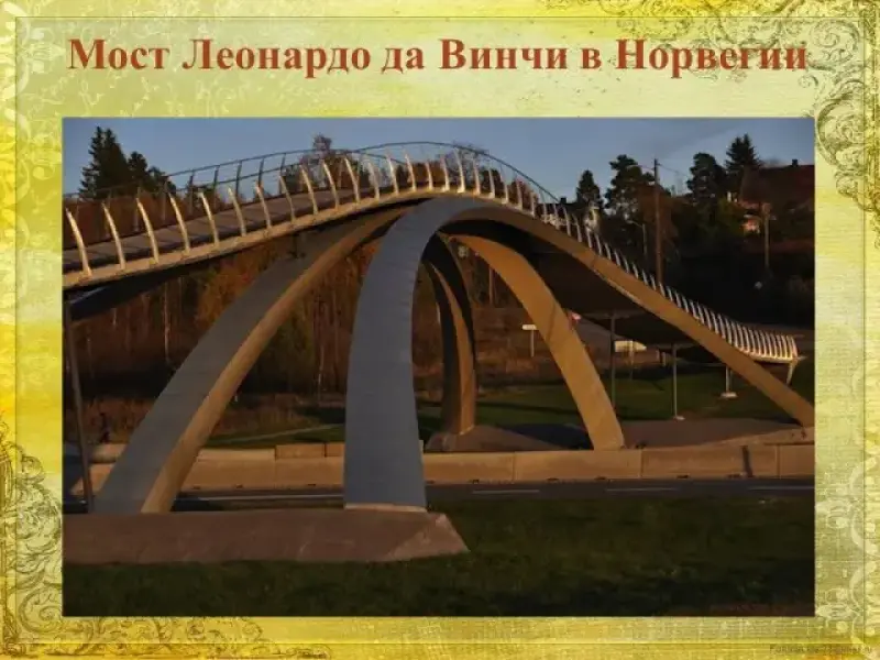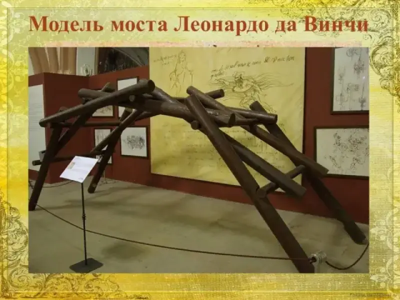 14 слайд - На этом наше путешествие подходит к завершению. Сейчас я бы хотела предложить вам небольшую практическую работу. Каждому на парту я раздам деревянные брусочки и поэтапную схему моста. Ваша задача состоит в том, чтобы почувствовать себя немного творцами и инженерами, каким был Леонардо да Винчи и собрать мост по его проекту (смотри рисунки). До конца урока у вас есть немного времени, так что можете приступать. Желаю удачи!!!