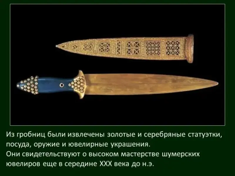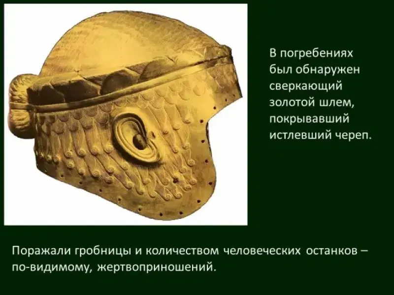 В 1920-х гг. во время раскопок, проводившихся в Уре под руководством английского археолога Леонардо Вулли, были обнаружены многочисленные погребения, в которых оказалось несметное количество ценностей. Экспедиции Вулли удалось найти две не потревоженные грабителями гробницы, находки в которых произвели сенсацию в мире (Слайд 16).