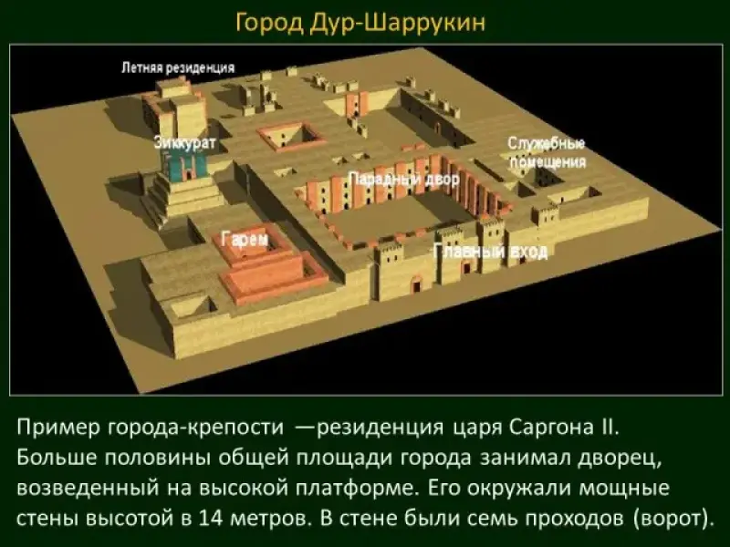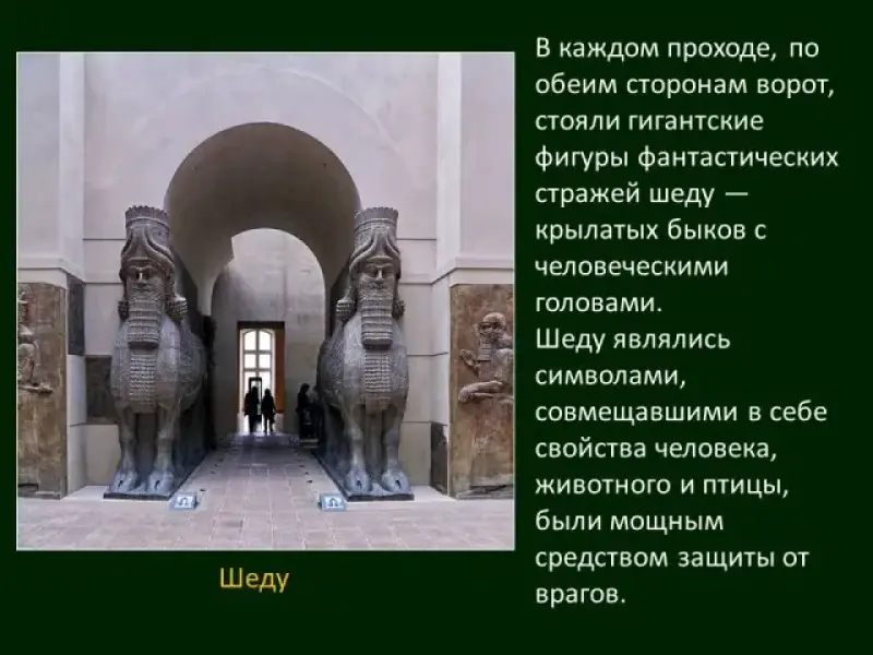 Постоянные войны определили характерную особенность ассирийского зодчества - расцвет крепостной архитектуры. Примером такого города может служить Дур-Шаррукин-резиденция царя Саргона II (Слайд 37). Больше половины общей площади города занимал дворец, возведенный на высокой платформе. Его окружали мощные стены высотой в 14 метров. В системе дворцовых перекрытий применялись своды и арки. В стене были семь проходов (Слайд 38). В каждом проходе, по обеим сторонам ворот, стояли гигантские фигуры фантастических стражей шеду - крылатых быков с человеческими головами.