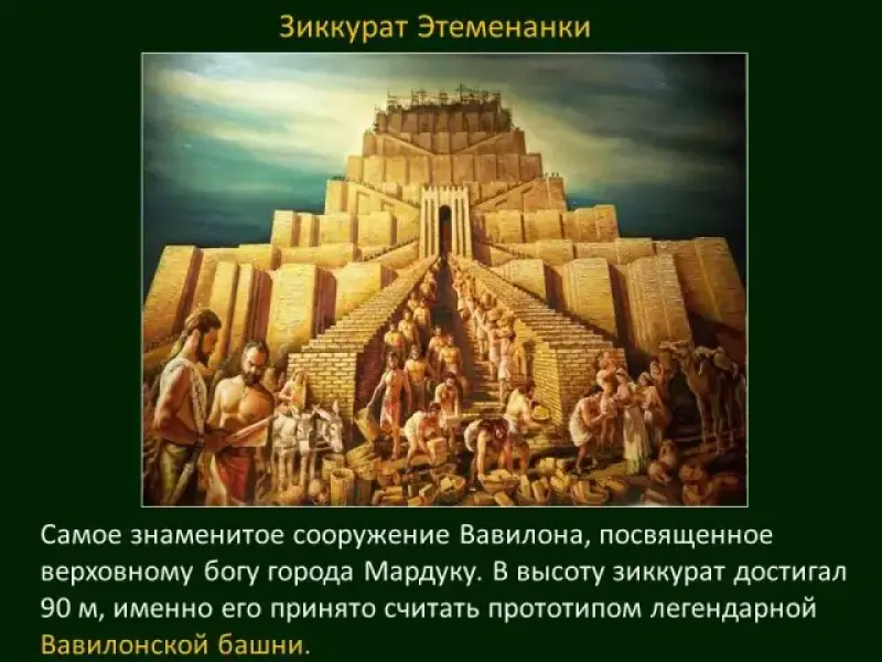 Учащиеся: выступают с подготовленным сообщением о зиккурате Этеменанки - прототипе легендарной Вавилонской башни (Слайд 52).