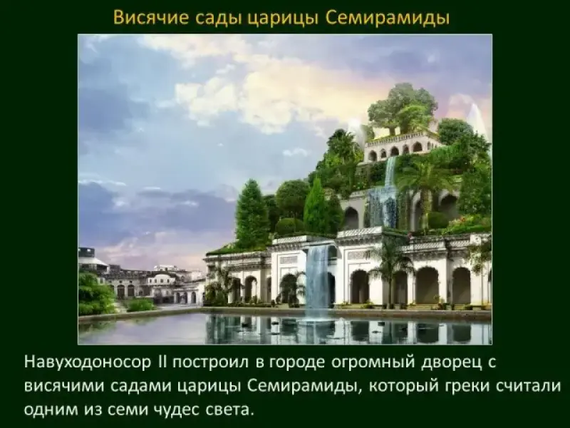 Учащиеся: выступают с подготовленным сообщением о дворце Навуходоносора II с висячими садами царицы Семирамиды (Слайды 53,54).