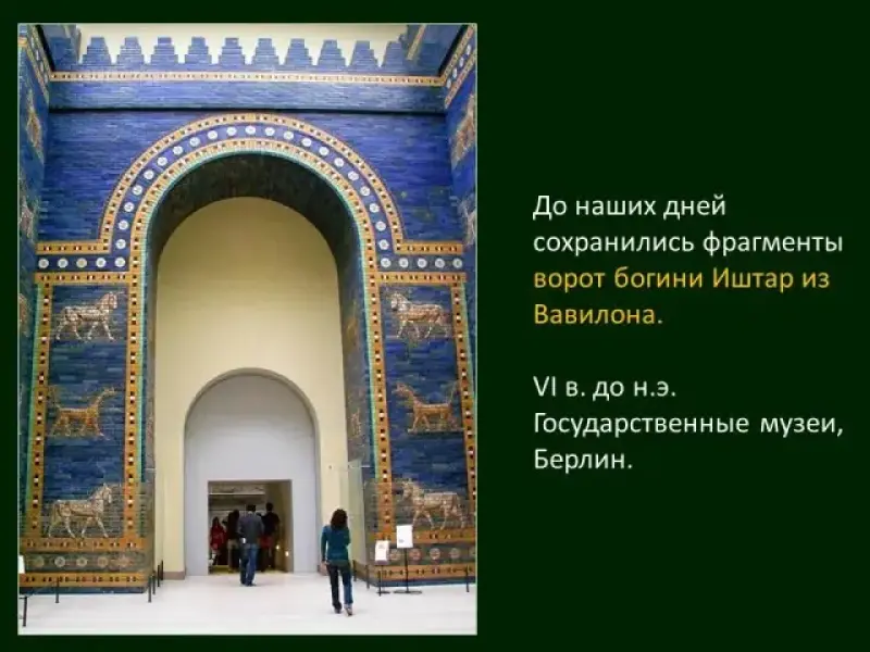 Преподаватель: В Вавилон вели восемь парадных въездных ворот, носивших имена главных божеств. От каждых ворот была проложена священная дорога к храму, посвященному одноименному божеству. Таким образом, вся территория города воспринималась как священное, храмовое пространство (Слайд 55). До наших дней сохранились развалины ворот богини Иштар (Слайд 56); эти ворота имели для вавилонян особое значение - от них мимо храма Мардука (Мардук - верховный бог Междуречья, бог-покровитель города Вавилона) шла Дорога процессий, по которой совершались торжественные шествия (Слайд 57). В конце XIX - начале XX вв. немецкие археологи откопали большое количество обломков городской стены, используя которые, удалось полностью восстановить исторический облик ворот Иштар, которые были реконструированы и ныне экспонируются в Государственных музеях Берлина. Ворота Иштар представляют собой огромную арку, по четырем сторонам которой стоят высокие массивные зубчатые башни. Все сооружение покрыто глазурованным кирпичом с рельефными изображениями священных животных бога Мардука - быка и фантастического существа Сирруш.