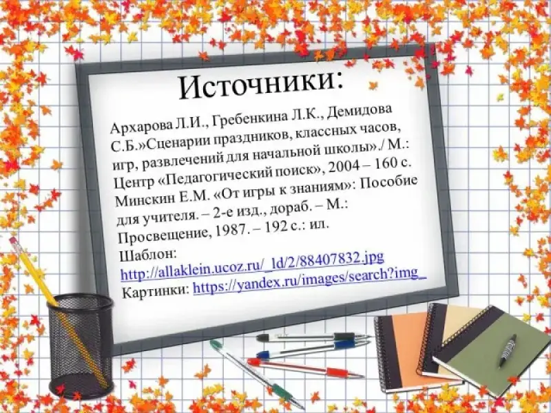 - Архарова Л.И., Гребенкина Л.К., Демидова С.Б."Сценарии праздников, классных часов, игр, развлечений для начальной школы"./ М.: Центр "Педагогический поиск", 2004 -160 с.