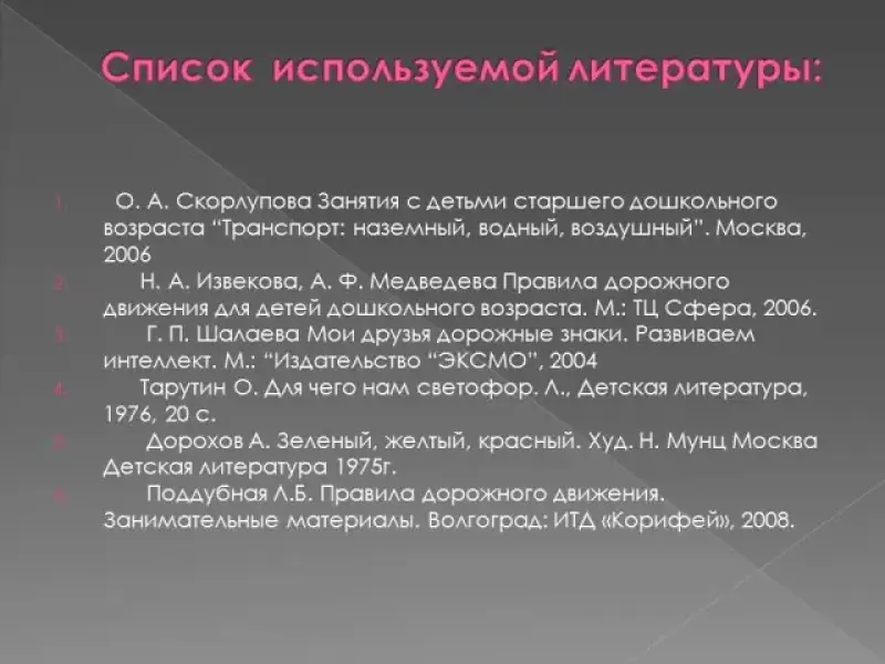 - Поддубная Л.Б. Правила дорожного движения. Занимательные материалы. Волгоград: ИТД "Корифей", 2008.