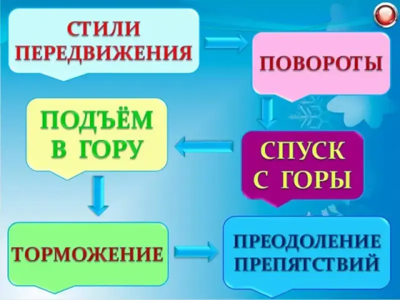 (слайд №17) - на этом слайде шесть видов передвижений на лыжах. Каждый вид передвижений - кнопка, на которую нужно нажать и ознакомится. Двигайтесь по стрелке, т.е., сначала нажимаете на "Стили передвижения", затем на "Повороты", "Спуск с горы", "Подъём в гору",