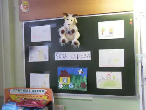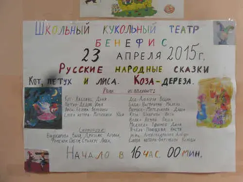 У входа в класс, где проходил спектакль, была вывешена афиша (РИС.1), нарисованная детьми. Всем приглашённым были розданы изготовленные учениками пригласительные билеты. На классной доске разместили рисунки детей - иллюстрации к сказкам (РИС.3) "Коза - дереза" и "Кот, петух и лиса".