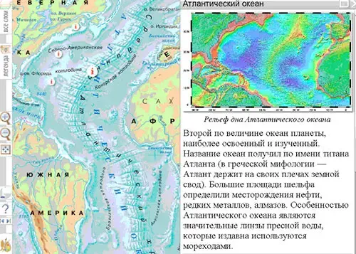 На некоторые карты добавлен привязанный к территории дополнительный иллюстративный и текстовый материал. Например: информационный блок к карте океанов содержит сведения о рельефе дна океана, хозяйственной деятельности людей.