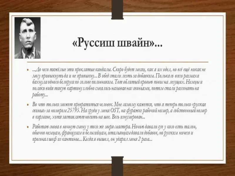 Слайд " Русская свинья". Вася Баранов попал на работы в Германию. Он выжил. Писал о том, как немцы издевались над русскими, били, смеялись. Сколько унижений, боли пронес Вася Баранов, чтобы выжить.