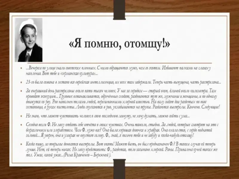 Слайд "Я помню, я отомщу". Роман Кравченко - Бережной умер в 2011г. Его дневники стали "свидетелями" на Нюрнбергском процессе. Грустные строчки о своей первой любви к девочке Фриде, которую убили. Действительно, жуткими записями отомстил фрицам.