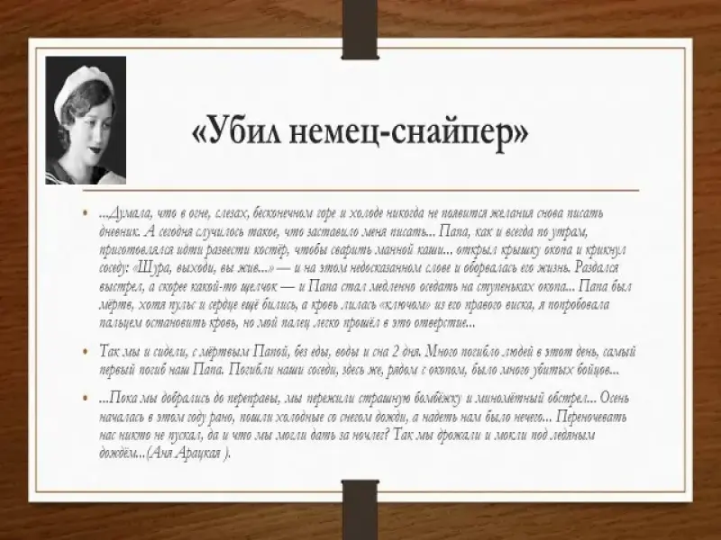 Слайд "Убил немец-снайпер". Аня Арацкая. Девочка писала дневник под пулями, чуть не на линии фронта, скитались по голодной и холодной волжской степи, п. ч убили отца, а в семье 9 человек. Выжили не все.
