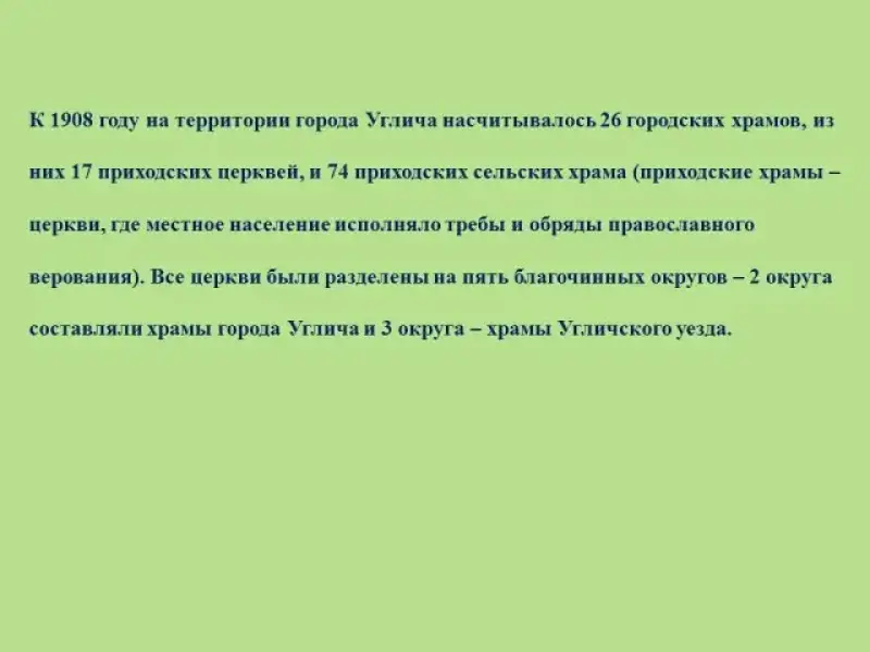 Слайд 4. К 1908 году на территории города Углича насчитывалось 26 городских храмов, из них 17 приходских церквей и 74 приходских сельских храма (приходские храмы - церкви, где местное население исполняло требы и обряды православного верования). Все церкви были разделены на пять благочинных округов - 2 округа составляли храмы города Углича и 3 округа - храмы Угличского уезда.
