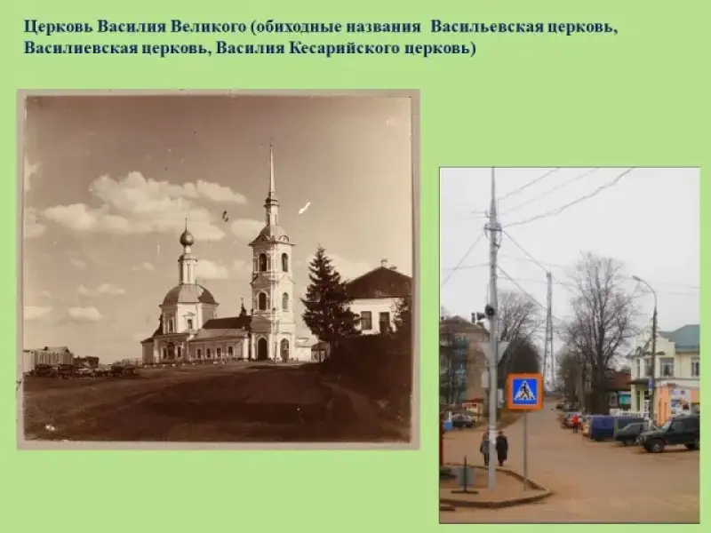 Слайд 6. Церковь Василия Великого (обиходные названия Васильевская церковь, Василиевская церковь, Василия Кесарийского церковь). Кирпичная церковь, построенная в 1727-1730 годах. Небольшое трёхчастное здание с храмовой частью типа восьмерик на четверике, пятигранным алтарём и протяжённой тёплой трапезной, в которой помещался придел Соловецких Чудотворцев. Колокольня четырёхгранная трёхъярусная, увенчанная шпилем, в стиле классицизма пристроена с западной стороны в начале XIX века. Церковь закрыта в 1920, разрушена (одна из первых) в 1929-1930. В 1956 г. на этом месте построена телевизионная вышка (ул. Гражданская).
