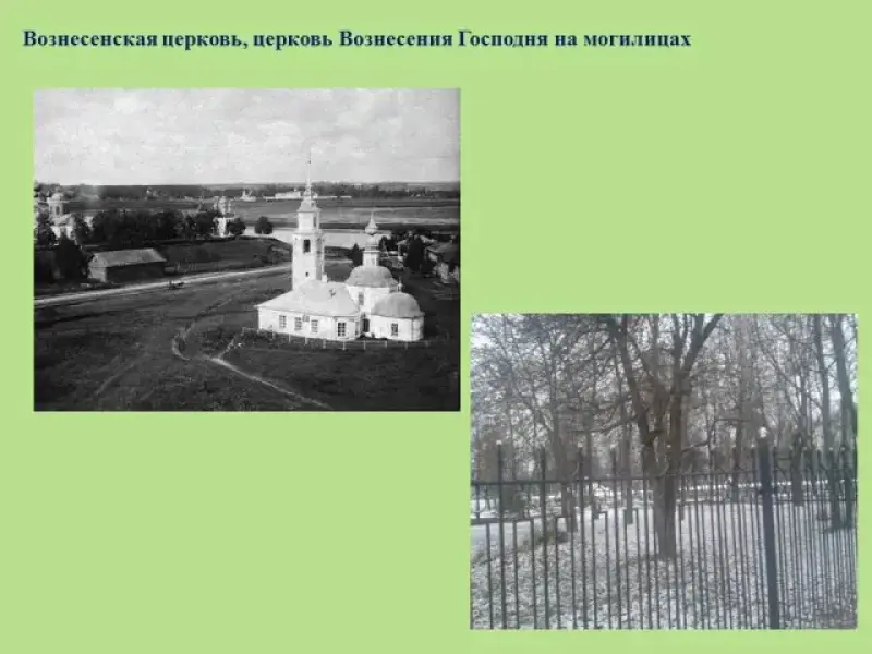 Слайд 7. Вознесенская церковь, церковь Вознесения Господня на могилицах. Старый адрес: Вознесенская площадь. Современный адрес: ул. Ольги Берггольц, Парк Победы. Кирпичная церковь, построенная в 1740-1742 на средства Т. Г. Тарханова. Небольшое четырёхчастное здание с храмовой частью типа восьмерик на четверике, тёплой трапезной с северным приделом Николая Чудотворца и столпообразной семигранной колокольней над папертью. В 1817 к трапезной с южной стороны пристроен придел в честь иконы Божией Матери "Всех скорбящих радости". Церковь закрыта в октябре 1938, сразу же начат снос. Церковь построена на месте прежних деревянных храмов Николая Чудотворца и Алексия Митрополита. Во 2-й пол. XVII в. к ним перенесен престол Вознесения Господня разрушенного в Смутное время монастыря, стоявшего в районе перекрестка нынешних ул. Каменской и Пролетарской.