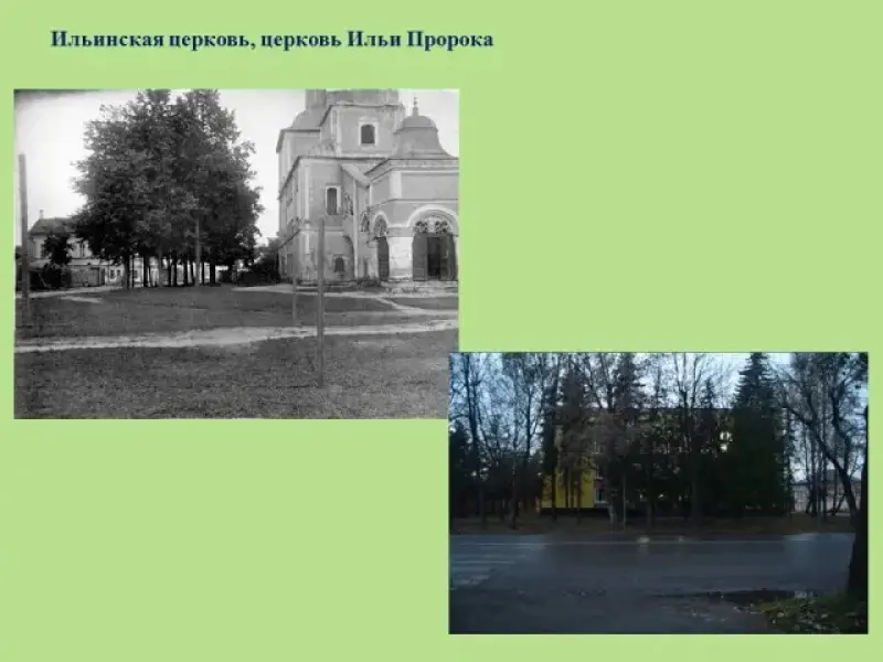 Слайд 8. Ильинская церковь (Ильи Пророка) располагалась на Ильинской площади (сейчас: пл. Пушкина). Кирпичная церковь, возведенная в 1748 на средства купцов Переславцевых, представляла собой 2-х этажную четырехчастную постройку с двухсветной храмовой частью, увенчанную небольшими восьмериками. Верхний холодный храм был Троицкий. Нижний теплый - Ильинский. Закрыта в 1929 году, разрушена в конце 30-х годов 20 века.