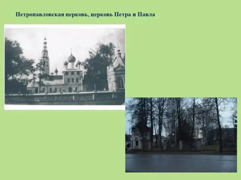 Слайд 9. Петропавловская церковь, церковь Петра и Павла (перекресток ул. 9-го Января и ул. Ленина). Кирпичная церковь, построенная в 1730-1735. Четырёхчастное здание с двухсветной храмовой частью, увенчанной пятиглавием. Над папертью возвышалась столпообразная восьмигранная ярусная колокольня. В начале XIX века с северной стороны к церкви пристроен придел, упоминаемый в разных источниках как Борисоглебский или Борисоглебско-Казанский. Храм закрыт в 1928, разрушен в конце 1930-х. До нашего времени сохранилась часовня церкви Петра и Павла.
