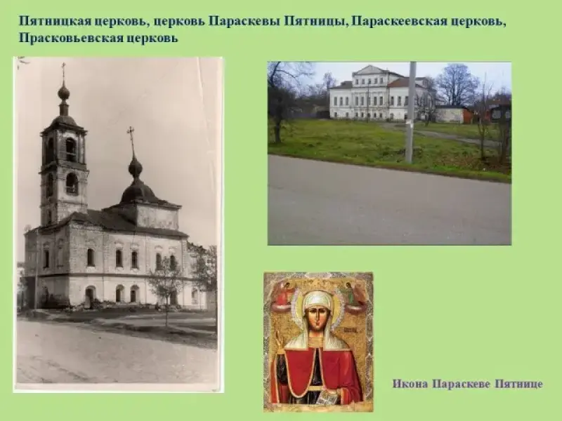 Слайд 10. Пятницкая церковь (церковь Параскевы Пятницы, Параскеевская церковь. Прасковьевская церковь). Адрес 1917 года: перекресток ул. Воскресенская и Пятницкого переулка, современный адрес: Советская площадь. Кирпичная церковь, построенная в 1759-1764. Двухэтажное четырёхчастное здание с односветной храмовой частью, первоначально завершённой деревянными шестериком, восьмериком и главой (после пожара 1822 заменены небольшой главкой). Алтарь пятигранный, над папертью возвышалась двухъярусная колокольня. Пятницкая церковь с отдалённых времен была домовым храмом подворья ростовских архиереев в Угличе. В 1780 приписана к Спасо - Преображенскому собору, была бесприходной. В нижнем этаже церкви в разное время размещались Угличское духовное училище и Духовное Правление.