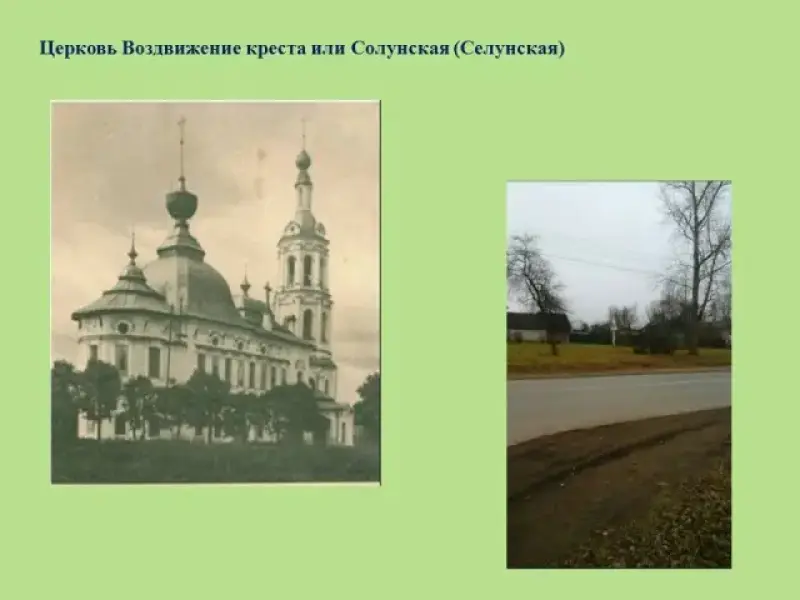 Слайд 11. На углу улиц Свободы и Октябрьской стояла удивительная по своей архитектуре церковь Воздвижение креста или Солунская (Селунская). Отсюда и улица Октябрьская называлась Крестовоздвиженская (Солунская), а Свободы - Благовещенская. Церковь была построена в 1775 году, была двухэтажной и имела два престола, то есть две самостоятельные церкви. Один главный престол во имя Воздвижения Честного и животворящего Креста Господня находился на втором этаже - летняя церковь и богослужения велись в теплое время. Второй престол во имя Святого великомученика Дмитрия Солунского находился на первом этаже и богослужения велись зимой. Церковь закрыта в 1927 году, разрушена в 1930.