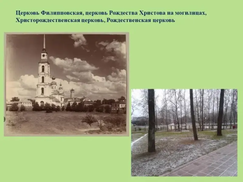 Слайд 12. Церковь Рождества Христова на могилицах (Христорождественская церковь, Рождественская церковь, Филипповская церковь). Адрес на 1917 год: Ярославская губ. Филипповская площадь. Современный адрес: ул. Ярославская, Парк Победы. Кирпичная церковь, построенная в 1799-1801. Большое четырёхчастное здание с пятиглавой двухсветной храмовой частью в виде четырёхлистника-квадрифолия и протяжённой трапезной с двумя приделами: Усекновения Предтечи и Апостола Филиппа, в которой находился зимний храм. В 1812-1821, вероятно, в рамках единого замысла, построена внушительная четырёхъярусная колокольня с поярусной расстановкой ордера, завершённая шпилем. Церковь закрыта в 1927, разрушена в 1937. Церковь построена на месте прежних каменного храма Рождества Христова и деревянного Апостола Филиппа.