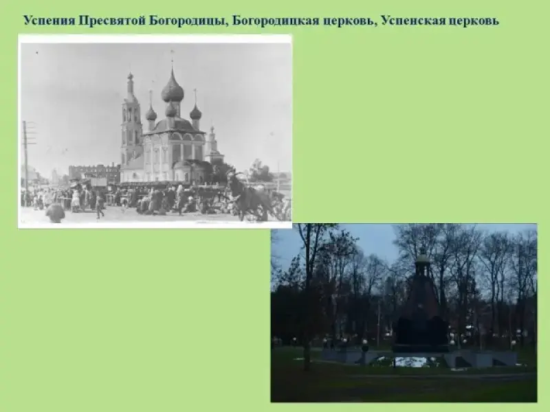 Слайд 13. Успенская церковь, Успения Пресвятой Богородицы, Богородицкая церковь. Церковь впервые упомянута в 1482, в тот период имела статус собора. Последний по времени храм построен в 1795-1799 вместо каменной Никольской и деревянной Успенской церквей. Церковь впервые упомянута в 1482, в тот период имела статус собора. Большое кирпичное четырёхчастное здание с пятиглавой двухсветной храмовой частью, трёхапсидным алтарём, тёплой трапезной с двумя приделами и примыкающей с запада восьмигранной четырёхъярусной колокольней. Приделы были: правый во имя Николая Чудотворца, Иоанна Златоуста и Алексия Митрополита, левый - Сергия Радонежского и священномученика Антипия.