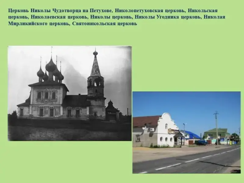 Слайд 16. Церковь Николы Чудотворца на Петухове, Николопетуховская церковь, Никольская церковь, Николаевская церковь, Николы церковь, Николы Угодника церковь, Николая Мирликийского церковь, Свято-Никольская церковь. Старый адрес: перекресток ул. Никольская и ул. Корсунская, современный адрес: перекресток ул. Пролетарская и ул. Нариманова. Кирпичная церковь, построенная в 1758. Одноэтажное четырёхчастное здание с двухсветной храмовой частью, увенчанной пятиглавием, с полукруглой алтарной апсидой, небольшой трапезной с тёплым храмом Рождества Богородицы и зауженной папертью, над которой возвышалась шатровая колокольня. Церковь закрыта в 1927, разрушена в 1940-1950-х. Около паперти церкви находился большой камень с выбитым изображением петушиной лапы, являвшийся древним мерянским межевым знаком, от которого, а также от легенды о появлявшемся на камне огромном петухе, предвещавшем несчастья, церковь и получила название. В XVII в. церковь находилась при слободке Роговке Алексеевского монастыря.