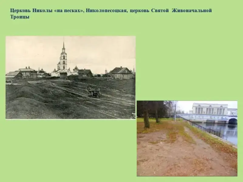 Слайд 17. Церковь Николы "на песках" (Николопесоцкая, церковь Святой Живоначальной Троицы). Кирпичная церковь, построенная в 1761. Большое одноэтажное четырёхчастное здание в стиле барокко с повышенной храмовой частью типа восьмерик на четверике, завершённой малым восьмериком и чашевидной главой. Алтарь пятигранный с фигурной кровлей, к храмовой части с севера и юга примыкали аналогичные объёмы. Трапезная протяженная, с Тихвинским и Никольским приделами, над папертью возвышалась четырёхъярусная колокольня простых форм, увенчанная шпилем. Церковь закрыта в 1933, разрушена в конце 1930-х. Вокруг храма располагалась слобода Заручье или Пески. Старый адрес: ул. Петербургская, выезд к переправе через Волгу, современный адрес: территория ГЭС.