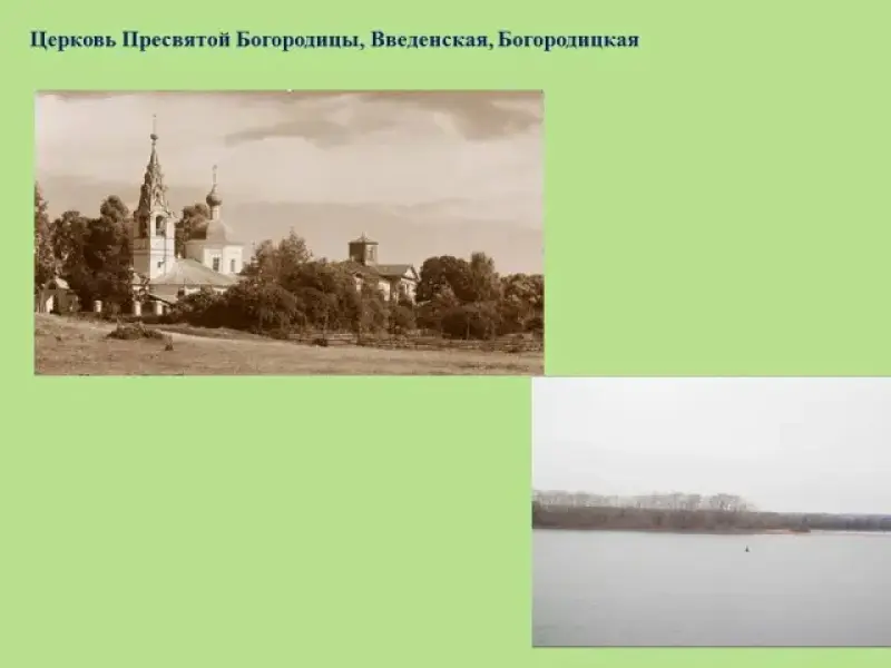 Церковь Пресвятой Богородицы, Введенская, Богородицкая. Кирпичная церковь, построенная в 1749 году. Небольшое четырёхчастное здание с храмовой частью типа восьмерик на четверике. Алтарь полукруглый, тёплая трапезная с одним приделом. Над папертью возвышалась шатровая колокольня, с западной стороны примыкало крыльцо. В 1796-1801 с южной стороны к храму был пристроен равный по объёму придел Тихвинской иконы Божией Матери, выполненный в классическом стиле, с четырёхколонным портиком по фасаду. Тёплый престол был Георгиевский. Церковь закрыта в 1927, разрушена при строительстве ГЭС. На месте церкви до Смутного времени находился Введенский женский монастырь. Позднее была построена деревянная приходская церковь. Кирпичная ограда с железными решётками и трёхпролетными Святыми воротами была сооружена в 1851 на средства купца П. М. Сурина.