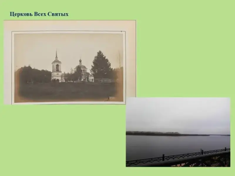 Слайд 19. Церковь Всех Святых (старый адрес: перекресток ул. Большая Всесвятская и ул. Малая Всесвятская, современный адрес: ул. Кирова). Кирпичная церковь в классическом стиле, построенная в 1821-1823 на месте прежнего деревянного храма, возведённого в 1776. Четырёхчастное здание с повышенной храмовой частью, завершённой ротондой с куполом и главой. С западной стороны примыкали тёплая трапезная с одним приделом во имя Харалампия и Власия и двухъярусная колокольня, увенчанная шпилем. Церковь закрыта в 1929, разобрана при строительстве ГЭС.