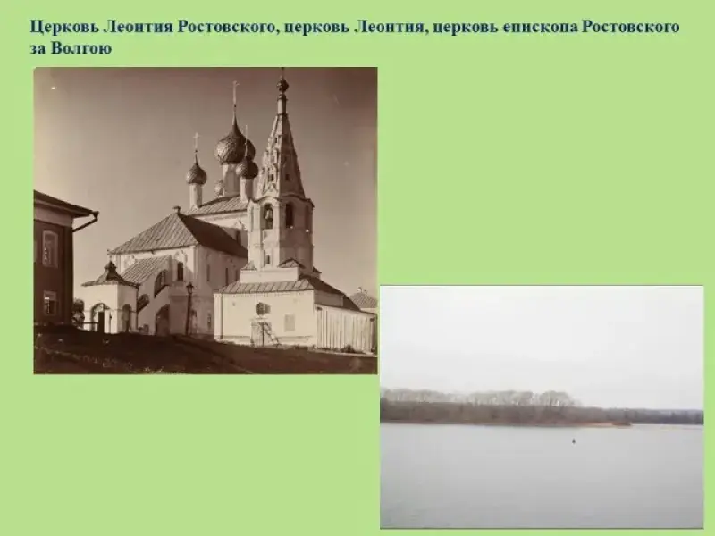 Слайд 20. Церковь Леонтия Ростовского, церковь Леонтия, епископа Ростовского за Волгою (старый адрес: перекресток левобережных улиц: Набережная и Петербургская, современный адрес: ул. Речная). Кирпичная церковь, построенная в 1778. Двухэтажное четырёхчастное здание с двухсветной храмовой частью, завершённой пятиглавием. Алтарь пятигранный, с запада примыкала трапезная. Нижний Никитский храм был предназначен для зимних богослужений. В декоре храмовой части было применено более двух тысяч зелёных поливных изразцов. К юго-западу от церкви располагалась отдельно стоящая шатровая колокольня. Церковь закрыта в декабре 1935, разобрана при строительстве ГЭС. Леонтьевская церковь была крупнейшим храмом левобережной Малой стороны.
