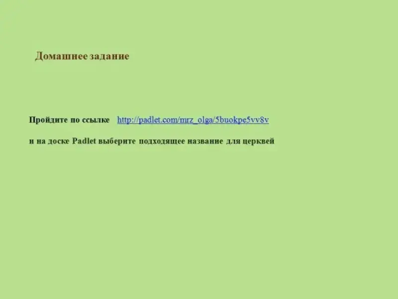 IV. Домашнее задание. Пройдите по ссылке http://padlet.com/mrz_olga/5buokpe5vv8v и на доске Padlet выберите подходящее название для церквей (слайд 22).