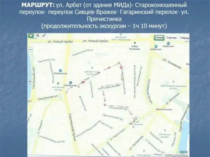 МАРШРУТ: ул. Арбат (от здания МИДа) - Староконюшенный переулок- переулок Сивцев-Вражек- Гагаринский перелок- ул. Пречистинка (продолжительность экскурсии - 1ч 10 минут)