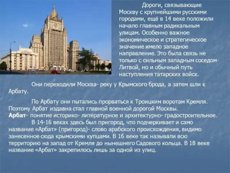 Дороги, связывающие Москву с крупнейшими русскими городами, ещё в 14 веке положили начало главным радикальным улицам. Особенно важное экономическое и стратегическое значение имело западное направление. Это была связь не только с сильным западным соседом - Литвой, но и обычный путь наступления татарских войск. Они переходили Москва-реку у Крымского брода, а затем шли к Арбату. По Арбату они пытались прорваться к Троицким воротам Кремля. Поэтому Арбат издавна стал главной военной дорогой Москвы.