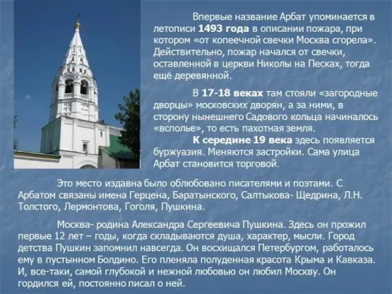Впервые название Арбат упоминается в летописи 1493 года в описании пожара, при котором "от копеечной свечки Москва сгорела". Действительно, пожар начался от свечки, оставленной в церкви Николы на Песках, тогда ещё деревянной.