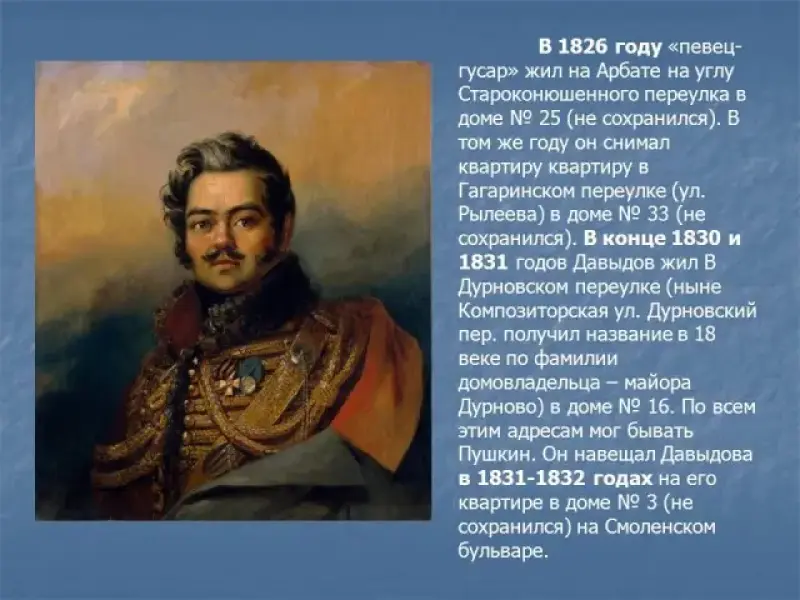 В 1826 году "певец-гусар" жил на Арбате на углу Староконюшенного переулка в доме № 25 (не сохранился). В том же году он снимал квартиру квартиру в Гагаринском переулке (ул. Рылеева) в доме № 33 (не сохранился). В конце 1830 и 1831 годов Давыдов жил В Дурновском переулке (ныне Композиторская ул. Дурновский пер. получил название в 18 веке по фамилии домовладельца - майора Дурново) в доме № 16. По всем этим адресам мог бывать Пушкин. Он навещал Давыдова в 1831-1832 годах на его квартире в доме № 3 (не сохранился) на Смоленском бульваре.