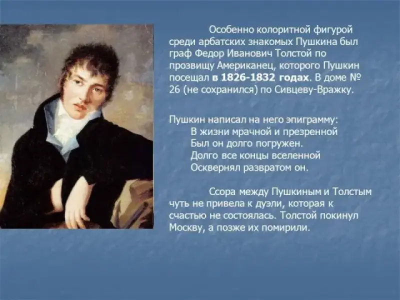Особенно колоритной фигурой среди арбатских знакомых Пушкина был граф Федор Иванович Толстой по прозвищу Американец, которого Пушкин посещал в 1826-1832 годах. В доме № 26 (не сохранился) по Сивцеву-Вражку. Он принимал участие в путешествии вокруг света с Крузенштерном, со всеми перессорился, всех перестроил и был высажен на берег в Камчатке и сухим путем добрался до Петербурга.