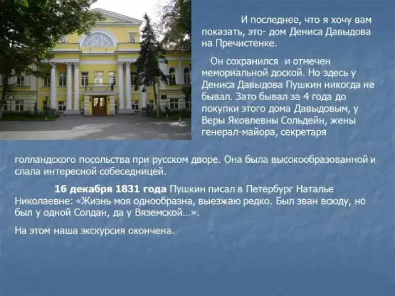 И последнее, что я хочу вам показать, это- дом Дениса Давыдова на Пречистенке (Приложение 1, № 7). Он сохранился и отмечен мемориальной доской. Но здесь у Дениса Давыдова Пушкин никогда не бывал. Зато бывал за 4 года до покупки этого дома Давыдовым, у Веры Яковлевны Сольдейн, жены генерал-майора, секретаря голландского посольства при русском дворе. Она была высокообразованной и слала интересной собеседницей.