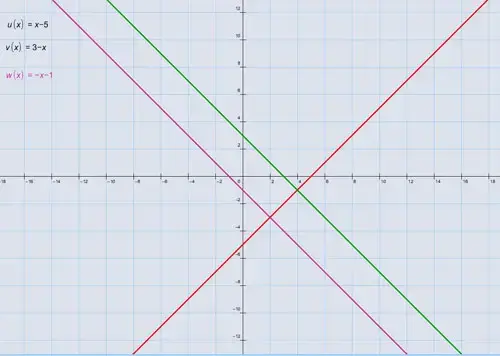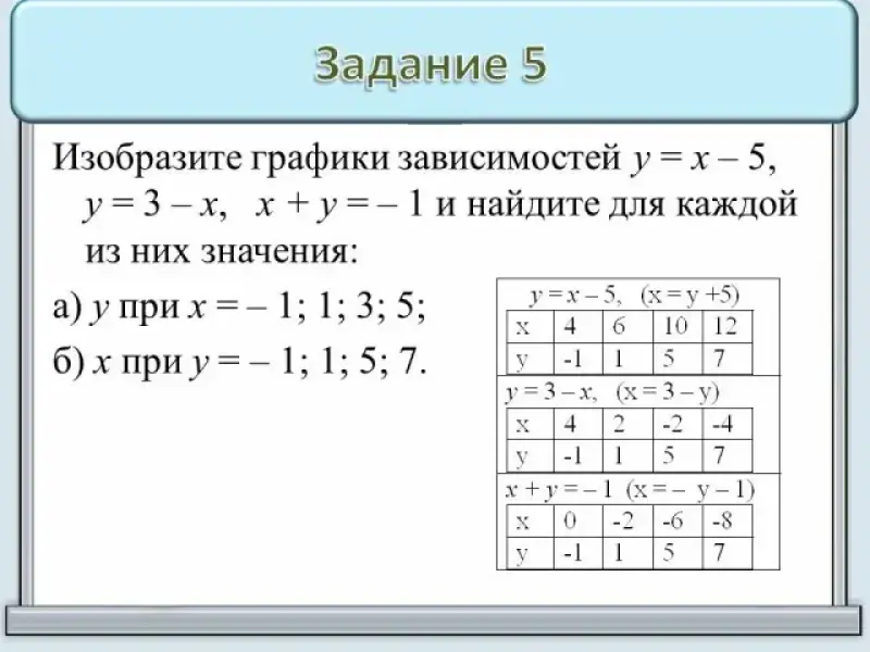 5. Изобразите графики зависимостей у = х - 5, у = 3 - х, х + у = - 1 и найдите для каждой из них значения:
