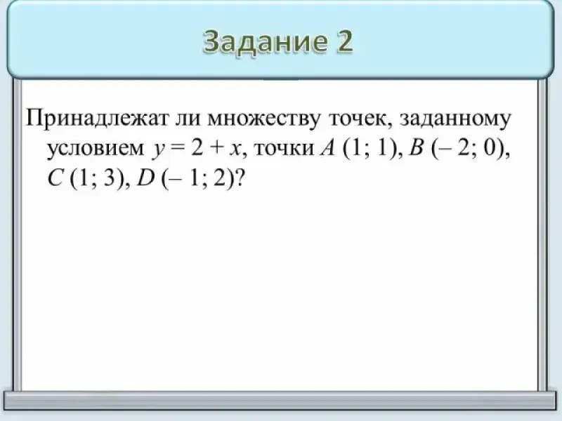 2. Принадлежат ли множеству точек, заданному условием у = 2 + х, точки А (1; 1), В (- 2; 0), С (1; 3), D (- 1; 2)? Слайда № 6