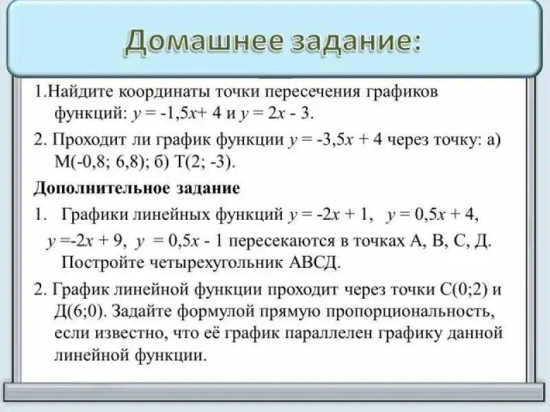 1.Найдите координаты точки пересечения графиков функций: у = -1,5х+ 4 и у = 2х - 3.