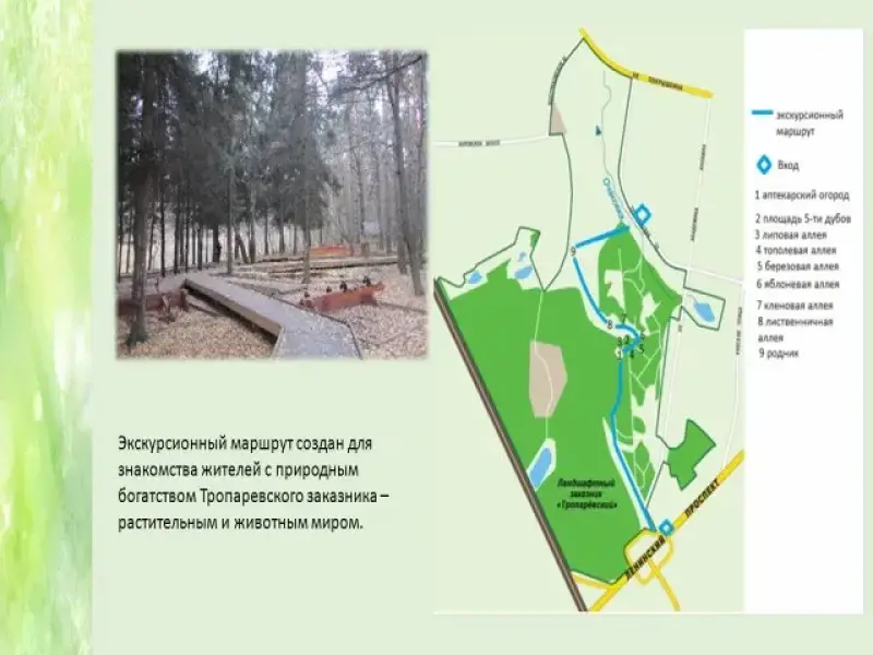 Название презентации: "Экскурсия по территории ландшафтного заказника "Тропаревский"