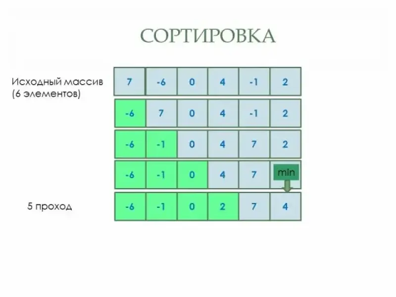 Учитель: Рассмотрим пример сортировки числового массива методом выбора. (Слайды 5-9)