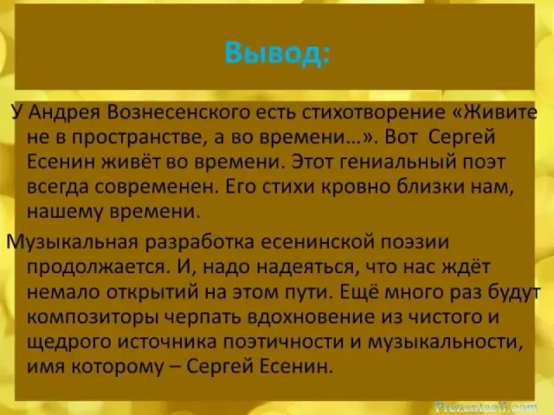 У Андрея Вознесенского есть стихотворение "Живите не в пространстве, а во времени...". Вот Сергей Есенин живёт во времени. Этот гениальный поэт всегда современен. Его стихи кровно близки нам, нашему времени.