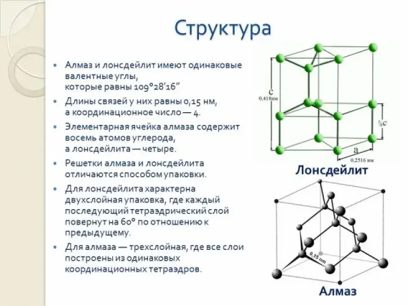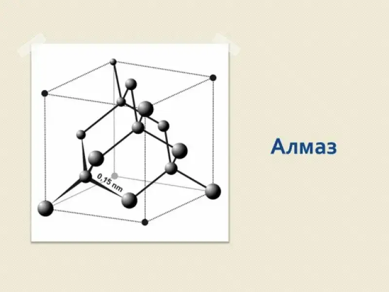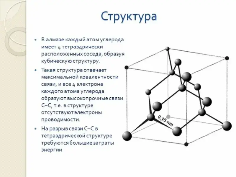 - Посмотрите на кристаллическую решетку алмаза. Каждый атом углерода в ней образует связь с четырьмя соединениями, все связи равноценные, что обусловливает высокую прочность. Какой вывод можно сделать?