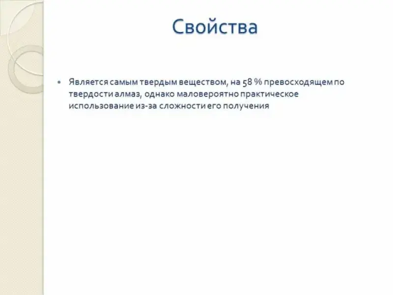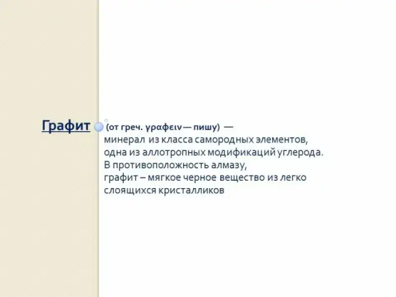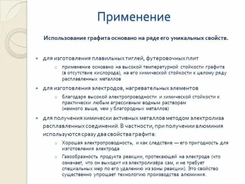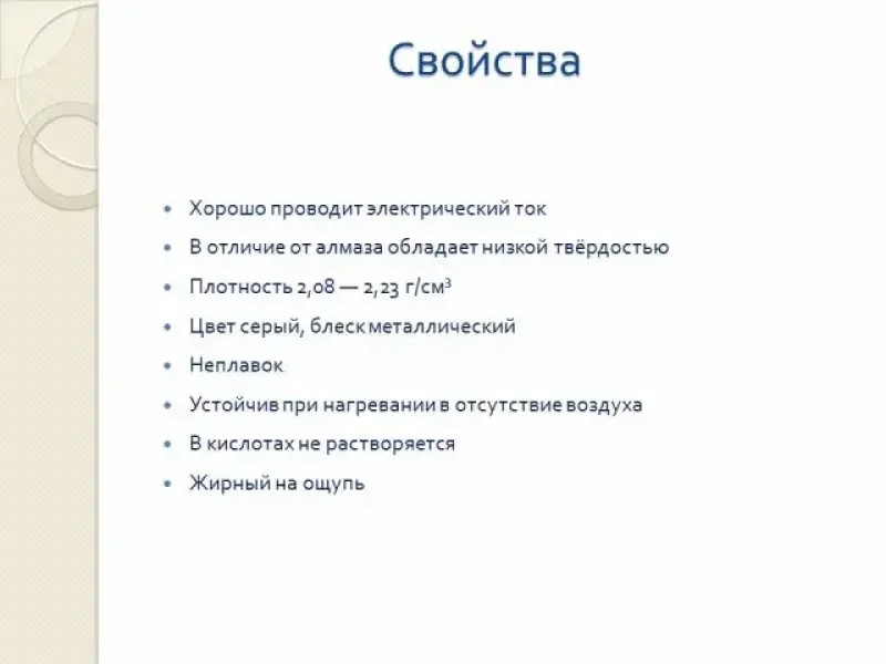 | свойства | Твердость | Хорошо проводит электрический ток, тугоплавкий, оказывает смазывающее действие | Химически стойкий, твердый | |