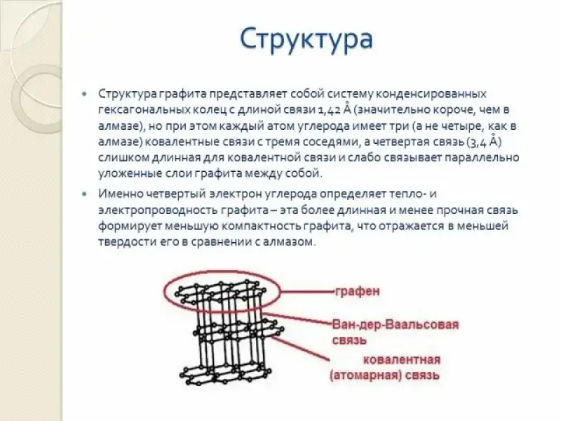 - Не все связи одинаковы. Связанные ковалентной неполярной связью атомы углерода, образуют слои из шестиугольников и каждый атом углерода образует только три связи с соседними, а один из четырех непарных электронов остается незадействованным внутри слоя. Между слоями действуют слабые силы межмолекулярного взаимодействия, следовательно, слои легко сдвигаются относительно друг друга. Как это доказать?
