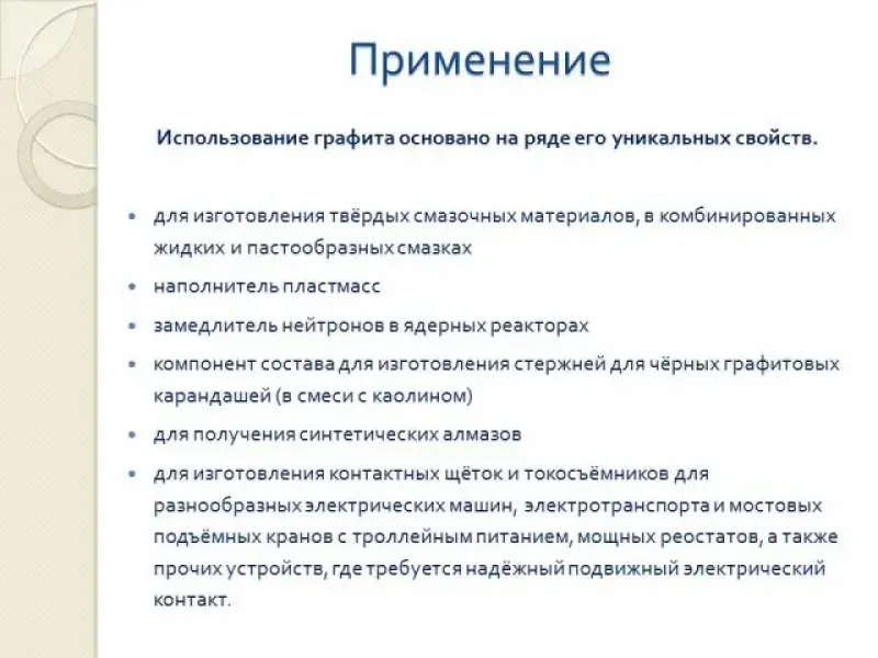 - Так как графит обладает электропроводностью, то он применяется в электротехнике (электроды, электрические контакты), из-за своей тугоплавкости он используется для облицовки сопел ракетных двигателей. Так как графит слоистый, то оказывает смазывающее действие на трущиеся поверхности. Где можно использовать это свойство?