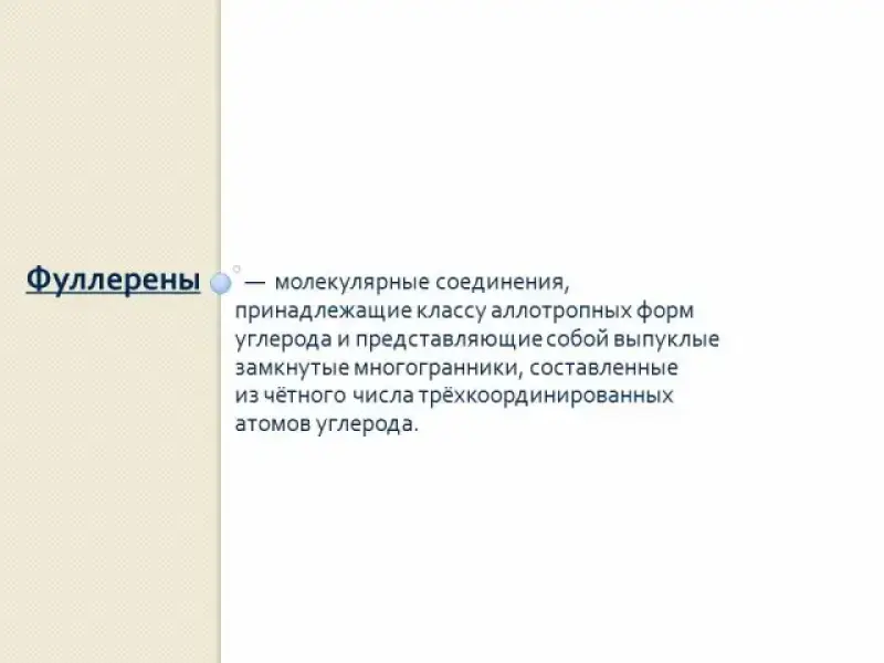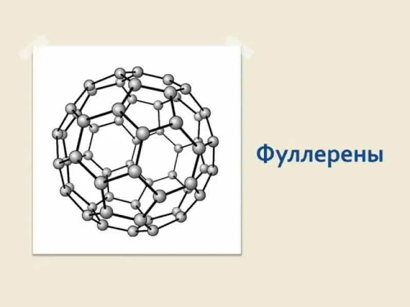 7. Учитель рассказывает о других аллотропных модификациях углерода. Карбин имеет цепочечную структуру, его роль в современной науке и технике незначительна. Фуллерен. Сравнительно недавно открытая аллотропная модификация. Молекулы состоят из правильных пятиугольников и шестиугольников, образующих сферу, напоминающую футбольный мяч. В сфере может быть 60, 70 атомов углерода. Внутрь сферы можно внедрить атомы других элементов, в результате образуются сверхтвердые материалы.