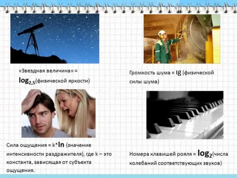 Психология. Психофизический закон Вебера-Фехнера: ощущения, воспринимаемые органами чувств человека, могут вызываться раздражениями, отличающимися друг от друга во много миллионов раз. Опыты показали, что организм как бы "логарифмирует" полученные им раздражения, т.е. величина ощущения пропорциональна натуральному логарифму величины раздражения.