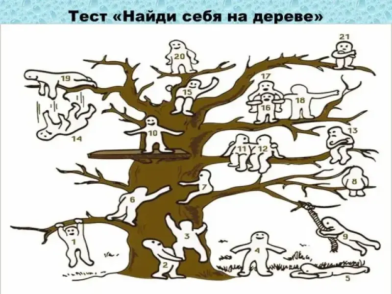 У всех человечков на дереве разные эмоции и занятия. Сначала нужно выбрать того, который, как вам кажется, больше похож на вас. А затем - того, на которого вы бы хотели быть похожим. На них указаны цифры, их необходимо записать в бланке теста. Указанные две цифры расскажут вам, целеустремленный ли вы человек, какая у вас самооценка и многое другое.