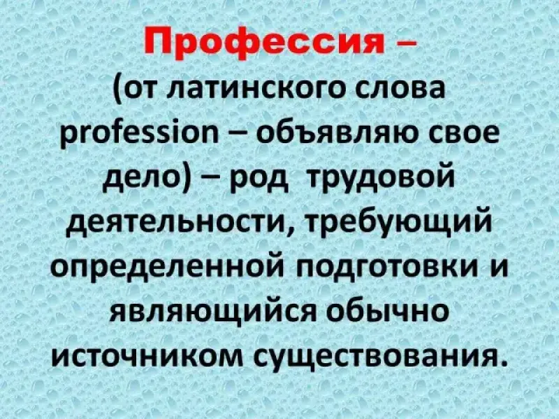 Запись. Профессия - (от латинского слова profession - объявляю свое дело) - род трудовой деятельности, требующий определенной подготовки и являющийся обычно источником существования (пример: слухачи, дегустатор воздуха и т.д.).