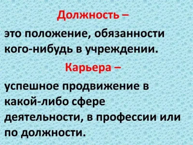 Должность - это положение, обязанности кого-нибудь в учреждении. За хорошие успехи в работе, трудолюбие, профессионализм человека могут повысить в должности - это карьера - успешное продвижение в какой-либо сфере деятельности, в профессии или по должности.